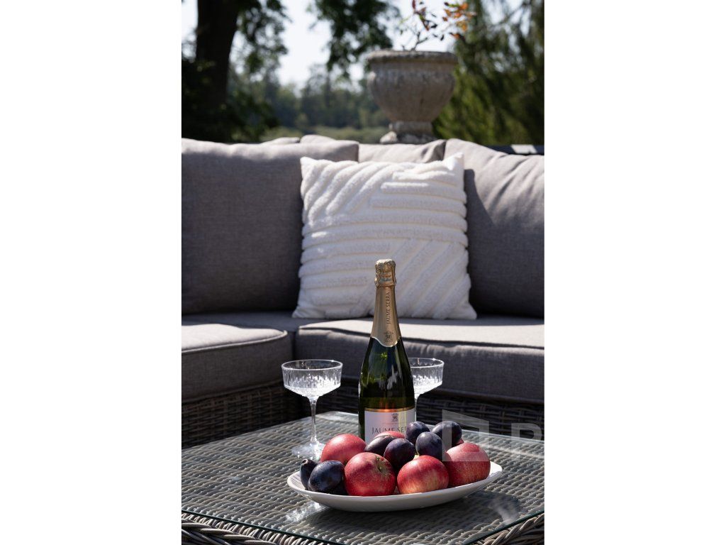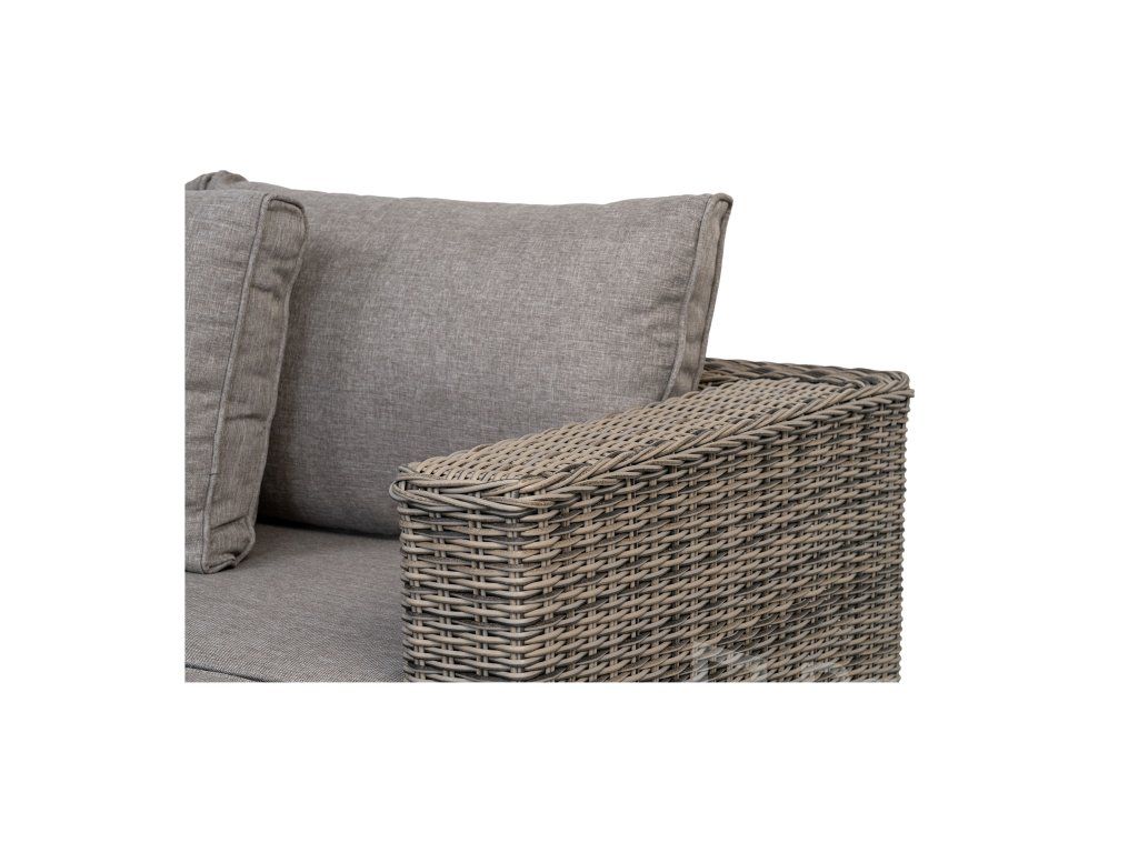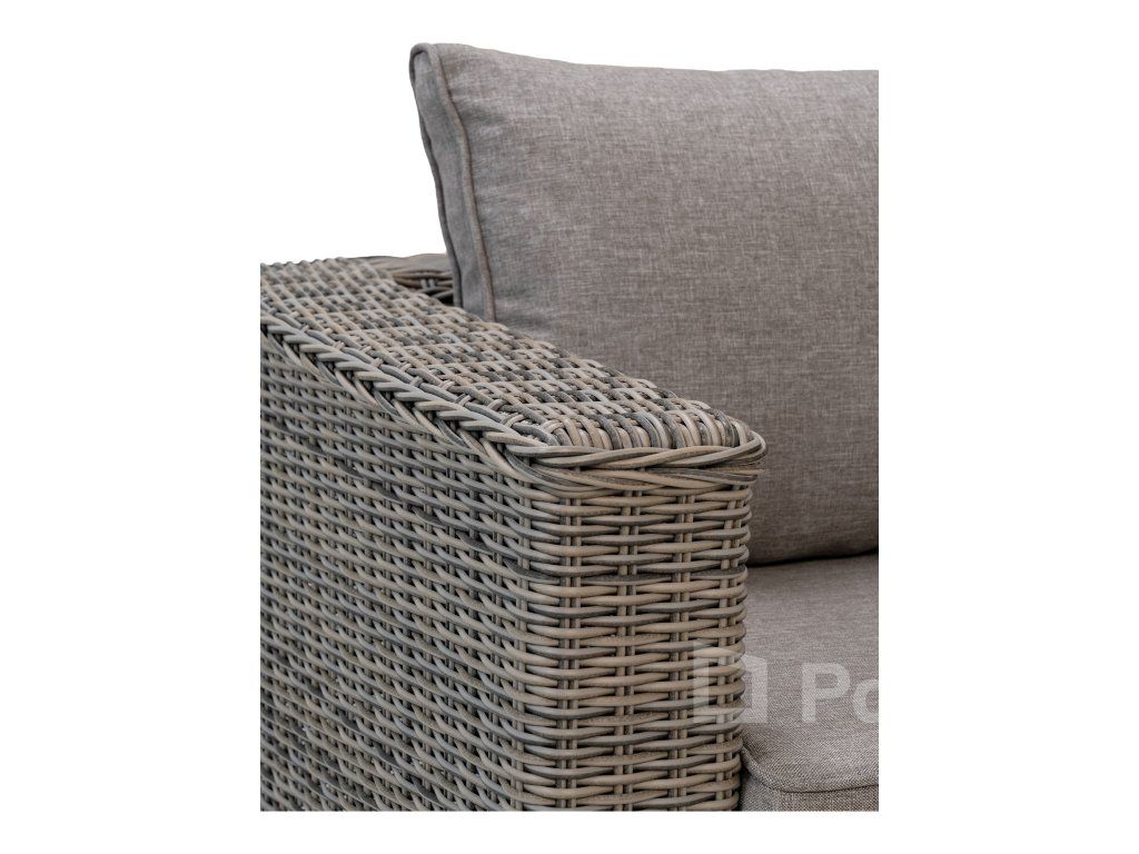 Materiál: PE Ratan, Oceľ (rám), Tvrdené sklo (5 mm), Polyester (podušky).