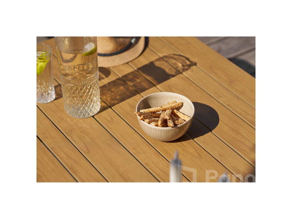 Základom setu Comillas je hliníková konštrukcia, ktorá je mimoriadne ľahká, ale zároveň pevná a odolná voči korózii. Na opierkach rúk a doske stola nájdete prvky z Nonwoodu, čo je materiál, ktorý verne imituje drevo, ale nepodlieha vplyvom počasia – nepraská, nehnije a netreba ho olejovať.