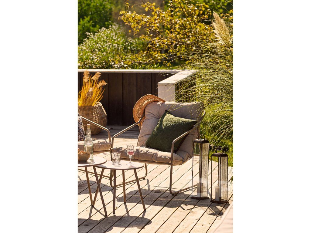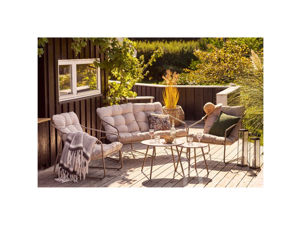 Set Nilo vyniká svojimi čistými líniami a zaoblenými tvarmi. Podobne ako set Abela, aj Nilo prináša obľúbený koncept dvoch okrúhlych stolíkov, ktoré môžete variabilne kombinovať, prisúvať alebo používať samostatne. Piesková farba kovu v kombinácii s ladiacimi poduškami vytvára harmonický celok, ktorý zapadne do každej modernej záhrady.