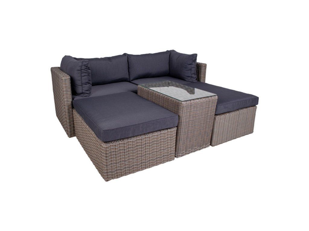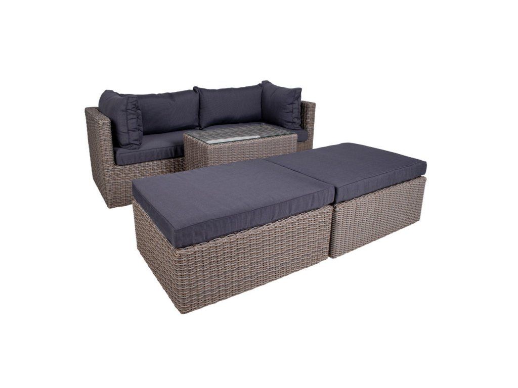 Komponenty v balení: 2x rohový modul, 2x taburet, 1x stolík so sklom, kompletné podušky.