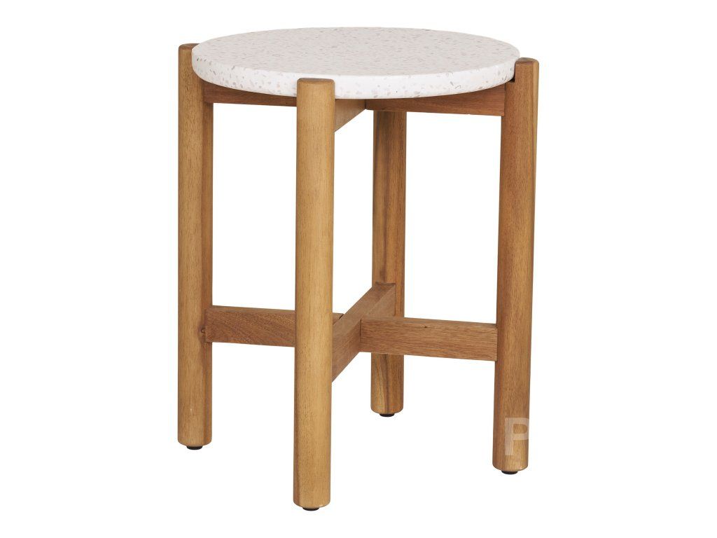 Základňa stolíka je vyrobená z masívneho akáciového dreva s certifikátom FSC® 100%, čo zaručuje najvyšší štandard ekologického a zodpovedného lesného hospodárstva. Vrchná doska s bielym terrazzo vzorom (jemné kamenné úlomky v cementovom základe) dodáva stolíku potrebnú váhu a stabilitu.
