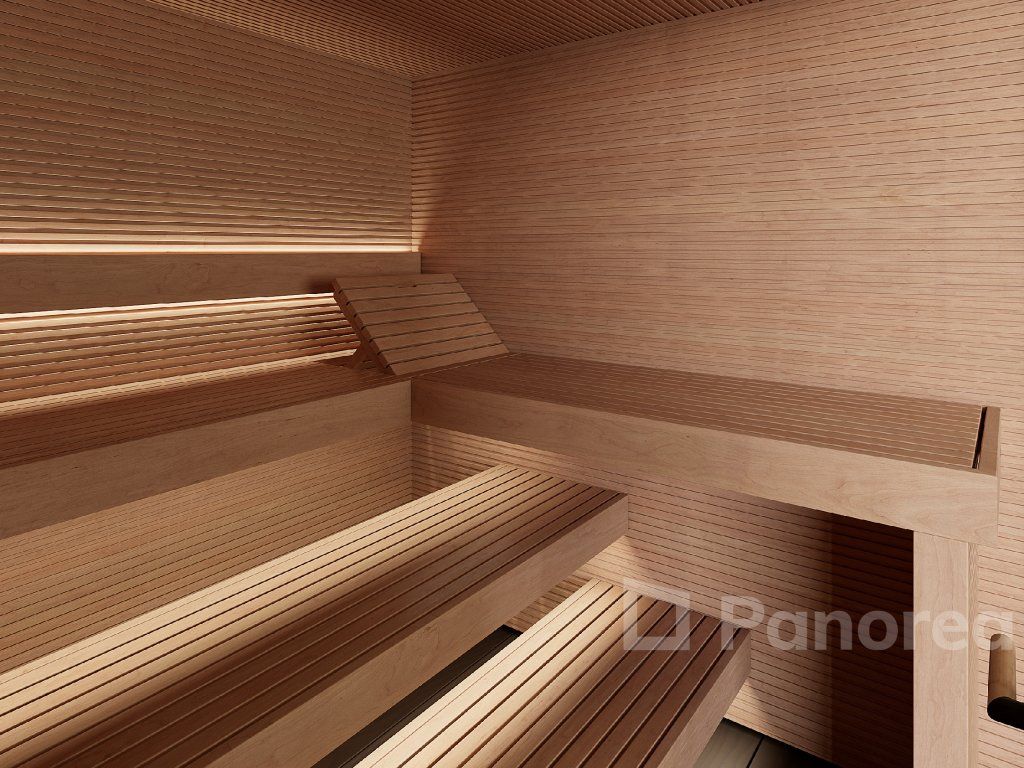 Súčasťou sauny je integrované LED osvetlenie umiestnené za operadlom, pod lavicami a na terase. Vytvára jemnú, vrstvenú a upokojujúcu atmosféru, wellness zážitok, ktorý nepôsobí iba funkčne, ale aj vizuálne výnimočne.
