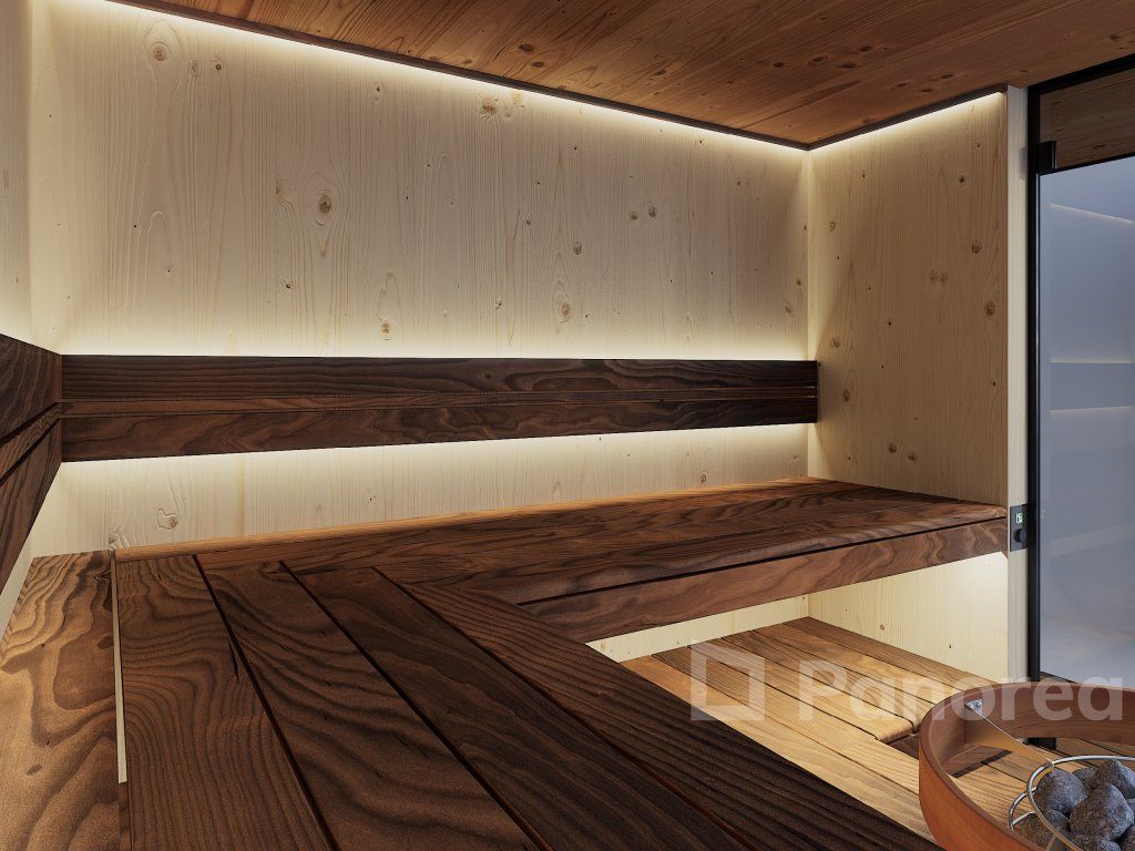 Veľkoformátové presklené steny opticky otvárajú interiér a prepájajú saunu s okolím. V kombinácii s plávajúcimi lavicami vytvárajú vzdušný, pokojný a luxusný priestor ako z architektonického časopisu.