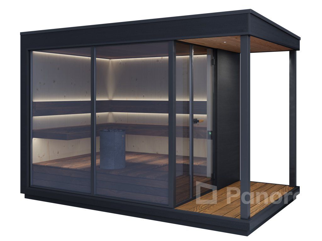 Priestranná sauna s rozmermi 367 × 220 cm a výškou 258 cm. Interiér je dostupný v prevedení brúsený smrek, brúsený thermo-smrek alebo thermo-radiata pine. Vhodná pre väčšie skupiny a komerčné wellness projekty.